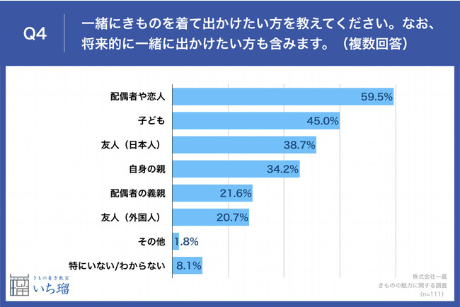「Q4.一緒にきものを着て出かけたい方を教えてください。なお、将来的に一緒に出かけたい方も含みます。(複数回答)」と質問したところ、「配偶者や恋人」が59.5%、「子ども」が45.0%、「友人(日本人)」が38.7%という回答となりました。