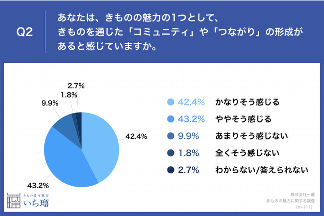 「Q2.あなたは、きものの魅力の1つとして、きものを通じた「コミュニティ」や「つながり」の形成があると感じていますか。」と質問したところ、「かなりそう感じる」が42.4%、「ややそう感じる」が43.2%という回答となりました。