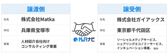 株式会社M&Aナビ(本社:東京都品川区、代表取締役:瀧田 雄介)は、人材紹介企業様向けの支援サービスを提供する株式会社Matkaと株式会社ガイアックスのM&Aを支援いたしました。