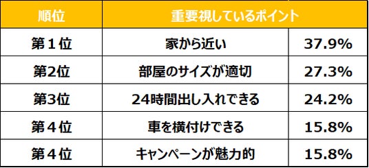 利用者に対して、トランクルームを選ぶ際に重要視しているポイントを尋ねたところ、最も多かった回答は「家から近い」(37.9%)で、以下、「部屋のサイズが適切」(27.3%)、「24時間出し入れできる」(24.2%)、「車を横付けできる」(15.8%)など、トランクルームを実際に利用する際の利便性が重要視しているポイントであることが分かる結果となりました。