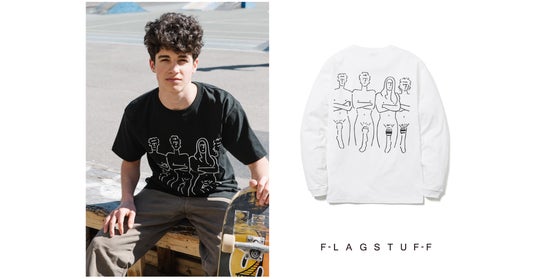 F-LAGSTUF-F の10周年を記念し、3年ぶりに長場氏とのコラボレーションが実現。F-LAGSTUF-F デザイナーが好きなバンドの代表的アートワークをモチーフにしたグラフィックを長袖Tシャツや半袖Tシャツ、KIDS Tシャツの他、ビアマグやソックスに落とし込みました。