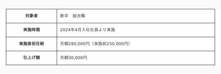 これに伴い、優秀な人材の獲得強化を図ることを目的として、2024年以降に入社される新卒入社も同様に初任給をこれまでの月額25万円から3万円アップの月額28万円に引き上げることといたしましたので、お知らせいたします。