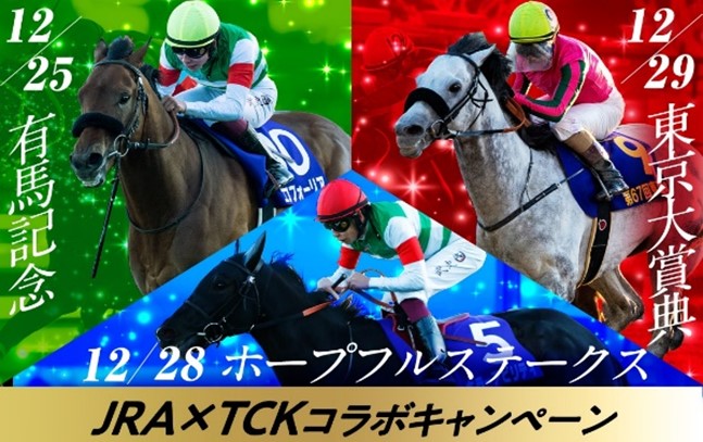 JRAのグランプリレース「12/25 有馬記念(GI)」と「12/28 ホープフルステークス(GI)」、ダート競馬の総決算「12/29 東京大賞典(GI)」の3つのGIレースをつなぐ「有馬記念×ホープフルステークス×東京大賞典コラボキャンペーン」を実施中!