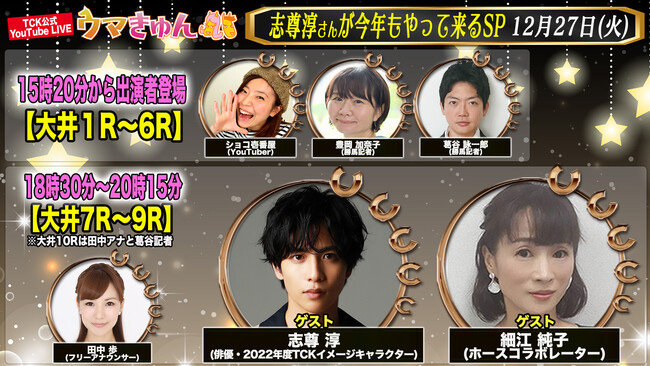 また、本特番は12月27日(火)のTOKYO MX(MX1)を皮切りに、東京大賞典当日の29日(木)までスカパー!やグリーンチャンネルなどのTVで放送されるほか、TCK公式YouTubeでも配信予定です。