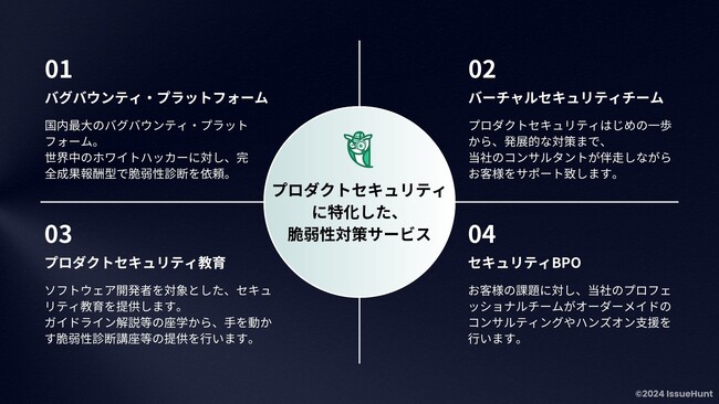 「IssueHunt」は、バグバウンティプラットフォーム「IssueHunt バグバウンティ」や「バーチャルセキュリティチームサービス」等のプロダクトセキュリティに関するサービスを提供しており、大手EC企業や上場SaaS企業など、幅広い業界の企業に導入いただいています。
