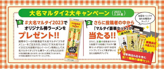 併せて『大名マルタイ2大キャンペーン』を実施。期間中大名マルタイコラボメニューご注文の方、SNSにて「#大名マルタイ2023」で投稿するとイートイン特典として大名マルタイオリジナル棒ラーメンがもらえます!