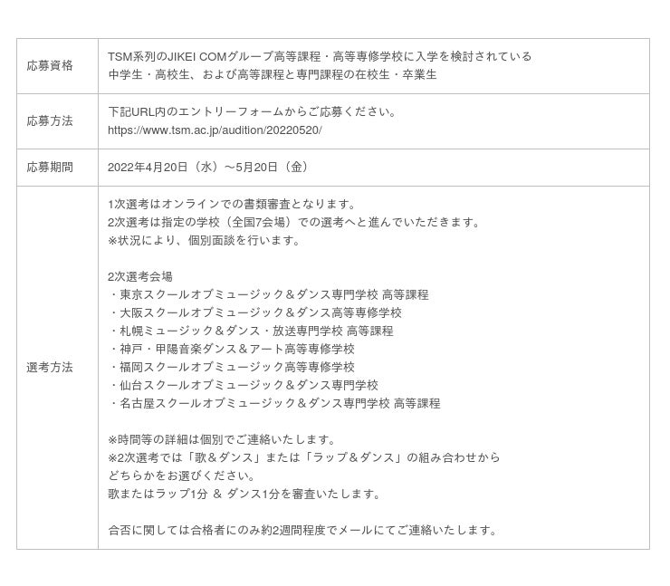 新学期の始まりに合わせて開催される今回のオーディションは、オンライン上で1次選考を実施。日本にいながら夢への第一歩を踏み出すことができるまたとないチャンスです。ダンススキルや歌唱力、活躍したいという強い想いなど、自身の才能や魅力を存分にアピールしてください。