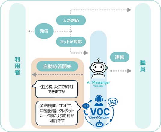 住民税に関する問い合わせのうち、納税通知書や申告、証明書の取得方法に関する一般的・定型的な質問について、生成AIを活用したボイスボットが質問の意図を理解し、職員を介さずに適切なFAQ※1を参照し自動回答を実施。ボイスボットがFAQで回答できない場合は、職員に電話を転送しお問い合わせ対応を実施しました。