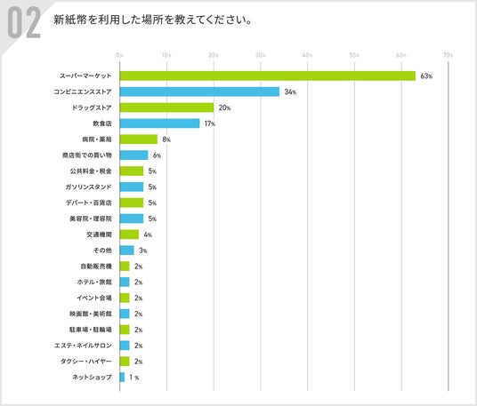 Q1で「普段の買い物で新紙幣を利用した」と回答した方に、具体的にどのような場所で使用したかを伺ったころ、「スーパーマーケット」が63%で最多となりました。次点は「コンビニエンスストア」34%、「ドラッグストア」20%と続く結果となりました。この回答から、日常的な買い物で利用していることが分かります。
