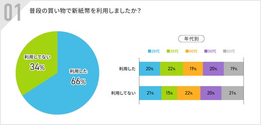 普段の買い物で新紙幣を利用したかについて伺ったところ、上記の通り66%の人が「利用した」と回答しました。年代別データでは偏りがなく、全年代が利用していることが分かります。