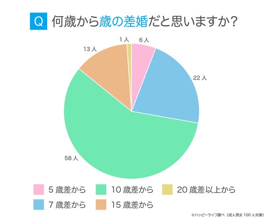 歳の差婚だと思う年齢差を聞いてみたところ、「10歳差から」と回答した人が58人で最多でした。