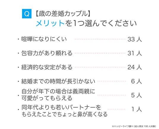 歳の差婚は相手に対して精神面や経済面で頼りやすく、安定した結婚生活が送れるメリットがあります。