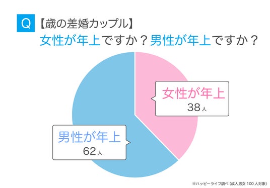 歳の差婚カップルにどちらが年上なのか聞いてみたところ、「男性が年上」は62人、「女性が年上」は38人でした。