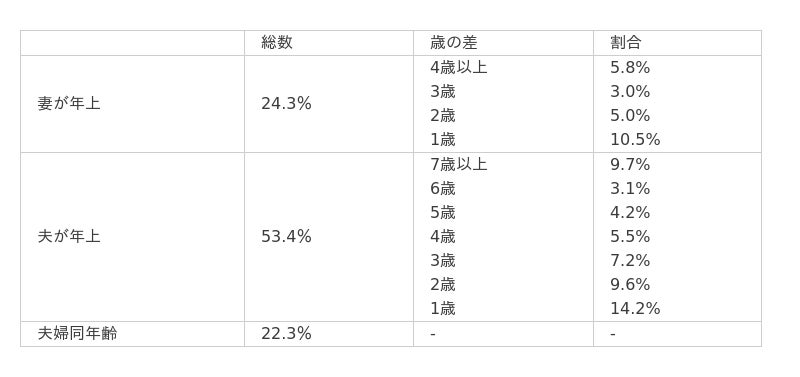 年齢差のある妻年上、夫年上の割合に大きな差があることからも、歳の差婚夫婦は男性が年上のパターンが多いといえるでしょう。