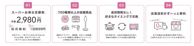 「アリスプライム」は、話題の最新家電や美容家電など700種類以上の商品が、月額2,980円(税込)で自由にご利用いただける定額制シェアリングサービスです。往復送料無料でいつでもお好きな商品に交換ができ、返却期限がないので安心して長期間ご利用いただけます。