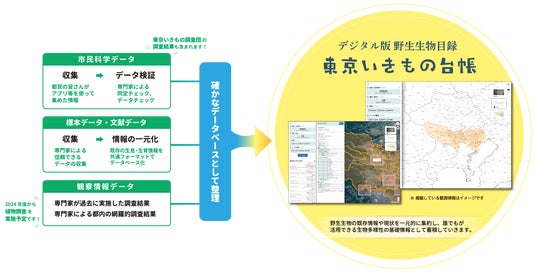 アプリ調査による投稿情報をもとにした「市民科学データ」と、過去の研究者の「標本・文献データ」や「観察情報データ」を合わせ、発見時期や位置情報などを結びつけたものです。今後、デジタルの強みを生かし情報を追加することで、台帳を更にアップデートしていきます。