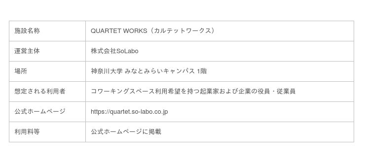 株式会社SoLabo(以下、SoLabo)は、学校法人神奈川大学(以下、神奈川大学)みなとみらいキャンパス1階区画において8月下旬にオープン予定の起業家向けコワーキングスペース「Quartet(カルテット)」(以下、カルテット)の公式ホームページを公開し、本日8月2日から問い合わせ受付を開始いたしました。