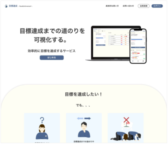このWebサービスは、”目標はあるけどどんなタスクが必要なのかわからない”、”達成までのイメージが湧かない”といった問題を解決するため、目標達成までに必要なタスクを整理し、その道のりを可視化することで効率良く目標を達成できるようにしたいという思いから作成しました。