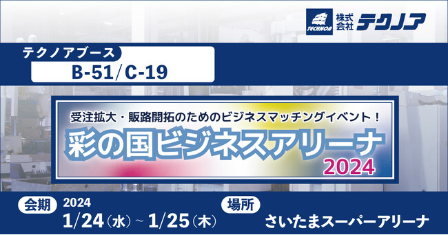 株式会社テクノア(本社:岐阜県岐阜市、代表取締役:山崎 耕治、以下:テクノア)は、1月24日~25日に さいたまスーパーアリーナ で開催される「彩の国ビジネスアリーナ2024」 に出展いたします。
