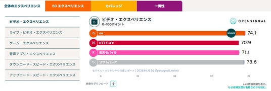 auは「一貫した品質」や音声およびゲーム・エクスペリエンスにおいて優れた結果を示し、安定したネットワークを提供しています。