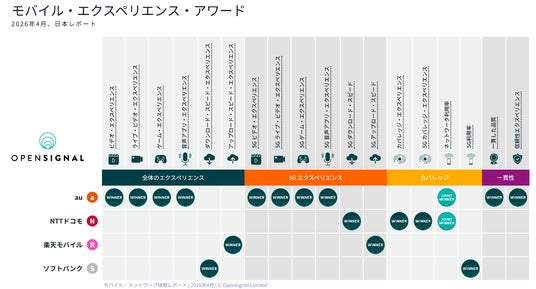 Opensignal(本社:ロンドン)は、最新の日本モバイル・ネットワーク・ユーザー体感レポート(2026年4月)を発表しました。 本レポートは、2026年1月1日から2026年3月31日までの90日間で、日本の主要なモバイル通信事業者4社(au、NTT ドコモ、楽天モバイル、ソフトバンク)のユーザーが実際に体感したモバイル・ネットワークの品質を包括的に分析したものです。