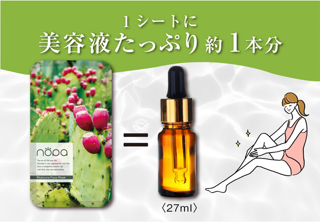 1包装に27mlの美容液が入っており、シート1枚をお顔に使った後でも袋にはたっぷりの美容液が残るように計算されております。あまった美容液で首やデコルテはもちろん、腕や脚まで全身の乾燥が気になる部分を保湿ケアしていただけます。