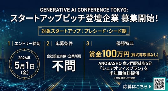 シード期のスタートアップを対象としたベンチャーキャピタルファンドを運営する株式会社ANOBAKA(本社:東京都港区、代表取締役:長野泰和、以下 ANOBAKA)は、ニッセイ・キャピタル株式会社、株式会社PKSHA Technology、ユナイテッド株式会社、アマゾンウェブサービスジャパン合同会社と共催で、生成AI領域の最前線を体感できるイベント「Generative AI Conference TOKYO」を2026年5月26日(火)に渋谷にて開催いたします。