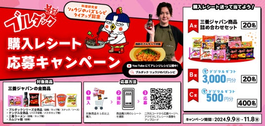 韓国大手総合食品メーカーの日本法人である 株式会社三養ジャパン(サムヤンジャパン)(本社:東京都、代表取締役:洪 範準)は、料理研究家リュウジのバズレシピとのタイアップを記念として、三養ジャパン全商品を対象に、購入したレシートをWeb上で登録すると、後日抽選で商品詰め合わせセットやデジタルギフトなどが当たるキャンペーンを2024年9月9日(月)から開催します。