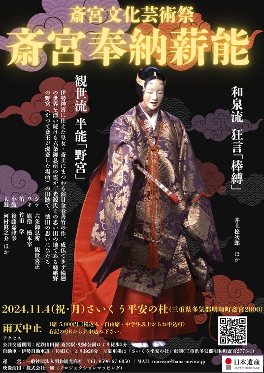 持続可能な観光地域づくりに取り組む一般社団法人 明和観光商社(三重県明和町・以下、明和観光商社)は、2024年11月4日(月・祝)・さいくう平安の杜(明和町斎宮)で無形文化財保持者・観世喜正による斎宮奉納薪能を開催します。