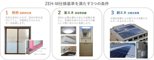ZEH-M仕様の集合住宅として認められるためには、「高断熱」「省エネ」「創エネ」の3つの基準を満たす必要があります。