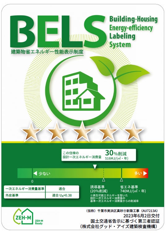 また、本物件は住棟・全住戸で建築物省エネルギー性能表示制度(Building-Housing Energy-efficiency Labeling System、「BELS」)の最高位である★★★★★(5つ星)を取得しました。