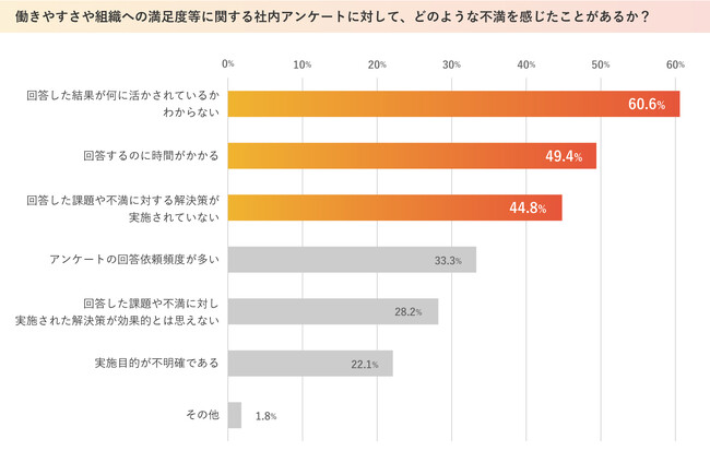 不満の理由として最も回答が多いものが「回答した結果が何に活かされているかわからない」となっており、エンゲージメントサーベイを実施する際には、その調査結果を活かす施策や取り組みとセットで実施する必要があると言えます。