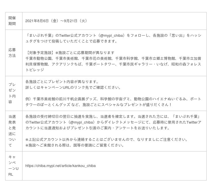 「まいぷれ千葉」公式Twitterアカウントをフォローし、所定のハッシュタグをつけてツイートをした方から抽選で、施設ごとのオリジナルプレゼントが当たります。