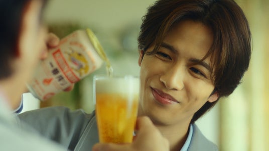 【志尊さん】:まさか「一番搾り」のCMに出させてもらえるとは思っていなかったので、ただただうれしいですし、早く完成したCMを見たいなという気持ちでいっぱいです。外で岸谷さんと二人でビールを飲みながら撮影している様子を客観的に見て、すごく幸せな時間だなと思いました。