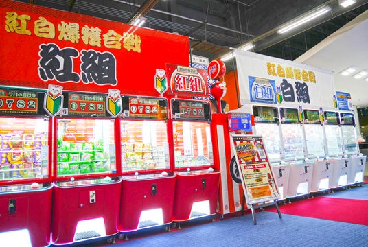 クレーンゲームを紅組、白組に分けて爆獲合戦!司会は爆獲奉行ならぬ、ちょんまげ姿のクラッピーがお客様を全力で応援するぞ!勝利予想で素敵な景品がGETできるかも!?(※写真はサープラ国分あそびタウン)