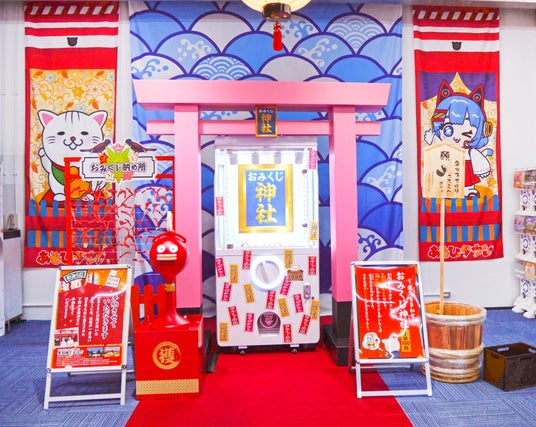 入口を入るとそこはお祭りの世界感。祭りばやしが流れる駄菓子参道の先には、拍手ロボットを携えた「おみくじ神社」がお客様の開運を応援します。初詣はあそびタウンで! (※写真はサープラ国分あそびタウン)