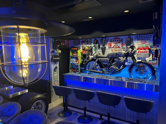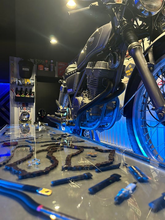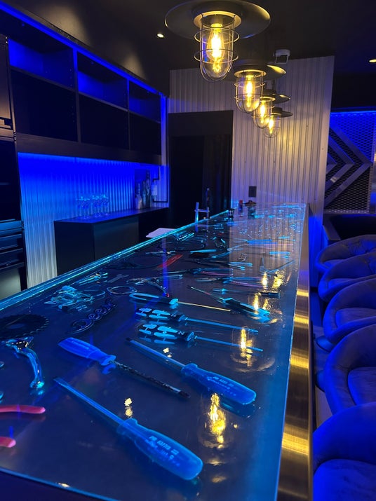 この圧巻のレジンアートテーブルを制作したのは、レジンアートチーム「Continues」の吉本淳平氏と徳永久令氏。 空間コーディネーター渡邉利幸氏とファクトリーギア株式会社 代表・高野倉匡人氏のアイデアと情熱によって、「大人が夢中で集えるガレージ」というコンセプトが、見事に具現化されました。このレジンテーブルには、ファクトリーギアの30年にわたる歴史の中で生まれた名作工具 やバイクのパーツが埋め込まれており、その前には本物のバイクも展示されています。まるで愛車を眺めなが ら至福の時間を過ごすような、特別なひとときを演出します。