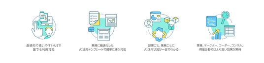 - 汎用的な業務用生成AI活用テンプレート複数の業務用生成AI活用テンプレートが事前に用意されており、導入後即座に業務プロセスの改善が図れます。テンプレートは汎用性が高く、簡単に導入できます。