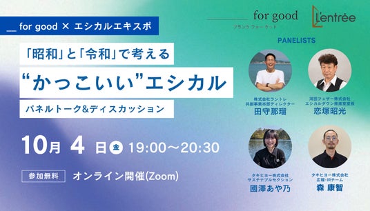 1751年創業の繊維商社タキヒヨー株式会社(本社:名古屋市西区、代表取締役 社長執行役員:滝 一夫)のオウンドメディア「__ for good(ブランク フォー グッド)」と株式会社ラントレ(本社:大阪市北区、代表:塗野 直透)が企画運営する「エシカルエキスポ」がコラボした参加型オンラインイベント「『昭和』と『令和』で考える“かっこいい”エシカル」を10月4日(金)19時より開催します。