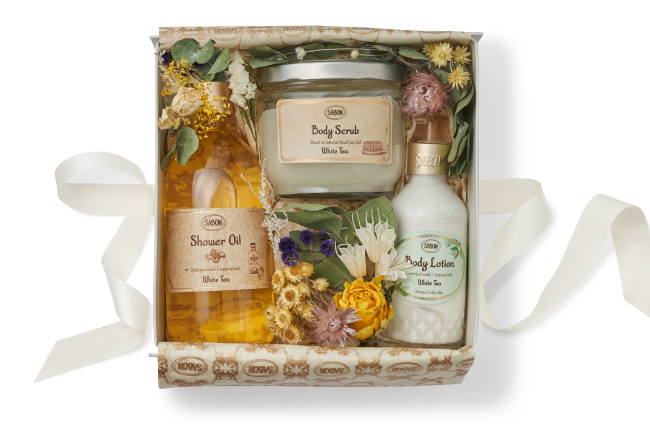 セット内容 桜井日奈子さんサイン入り写真、シャワーオイル ホワイトティー 500mL、ボディスクラブ ホワイトティー 600g、ボディローション ホワイトティー 200mL、ギフトボックス、SABON × RIN『FLOWER SHOP』ドライフラワー