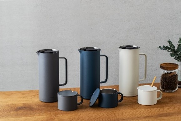 発売以来公表をいただいている「リビングポット」を、よりリビングに馴染むカラー展開でリニューアル。2023年度グッドデザイン賞を受賞した「ステンレスマグ」とペアリングも。