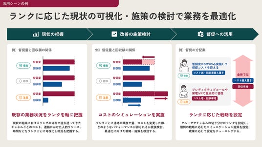 「クレジットバリュー評価」の提供を通じて、これまでの業務の自動化に加え、コストや工数の無駄を排除するだけでなく、優先的に連絡すべき対象を見極めることで、通知施策の最適化・最大化をサポートし、「督促する側」「督促される側」の双方により良い体験を提供していきます。