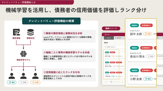 債権管理業務のDXを推進するLecto株式会社(本社:東京都渋谷区、代表取締役社長:小山裕、以下「Lecto(レクト)」)は、債権管理・督促業務の自動化および一元管理ができる「Lectoプラットフォーム」において、AIで顧客情報や支払いデータを分析し、通知手段やコストの最適化をアシストする新機能「クレジットバリュー評価」を追加したことをお知らせします。