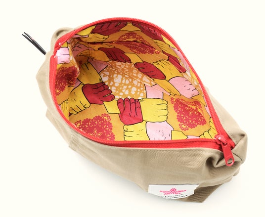 ポーチ内側にはアフリカンテイストのテキスタイルを採用