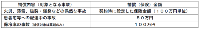 本制度は、一般的な火災保険では補償されない薬剤の配達中の事故による損傷や、保冷庫の温度設定ミスや自然災害等に起因した停電による保冷庫の機能停止を原因とした薬剤の損傷を補償します。