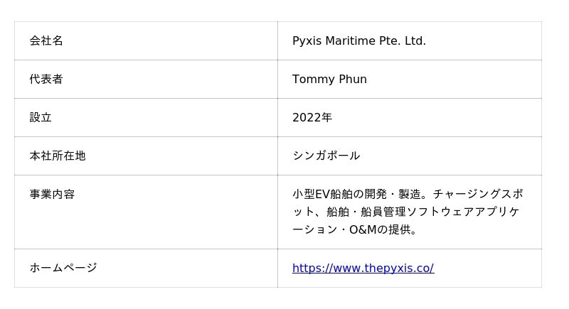 株式会社MOL PLUS (代表:阪本 拓也、本社:東京都港区、以下「MOL PLUS」)は、小型EV船舶の開発・製造およびチャージングスポット事業を運営するPyxis Maritime Pte. Ltd.(代表:Tommy Phun、本社:シンガポール、読み:ピクシスマリタイム、以下「Pyxis」、註)への出資を決定しました。