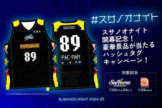 1月対象試合の2節(合計3試合)限定。いつものホームゲーム会場と違う仕様を見つけて写真撮影&「#スサノオナイト」を付けてXでポストしていただいた方の中から抽選で、1節につき1名様に選手直筆サイン入り「Pixel Designバスケシャツ」をプレゼントいたします。