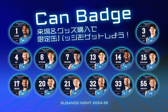 対象の試合にて、各日先着で、スサノオナイト限定缶バッジをランダムでプレゼント。LINEの来場登録とあわせて、オフィシャルグッズストアで3,000円以上ご購入いただいた方にもランダムでプレゼント。限定缶バッジのコンプリートを目指していただけます。