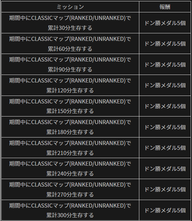 ・既存・復帰プレイヤーの方は2つの対象ミッションクリアでドン勝メダルを最大で100個獲得できます