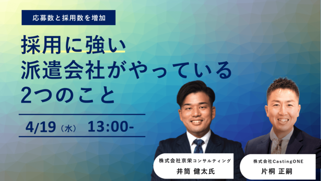 株式会社CastingONE(キャスティングワン、本社:東京都千代田区、代表取締役:野澤 怜司)は、株式会社京栄コンサルティングと共催ウェビナー「採用に強い派遣会社がやっている2つのこと」を開催いたします。
